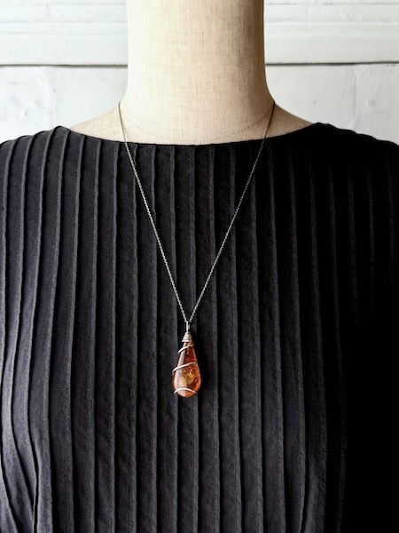 大きめの琥珀に滑らかに巻き付いた銀線のデザインも素敵です。