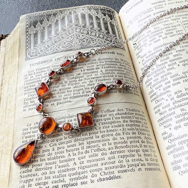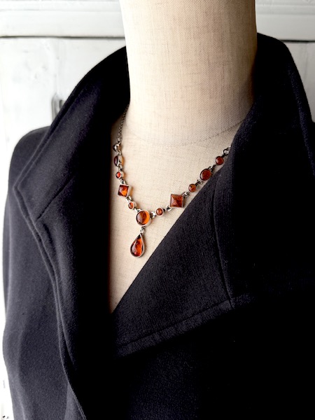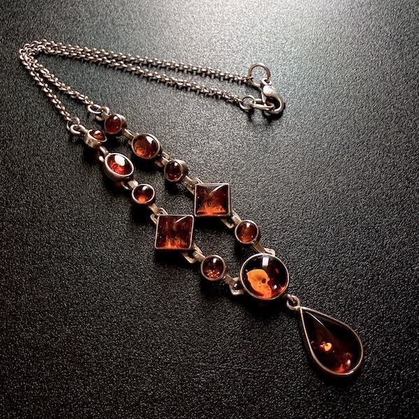 大小様々な12粒のアンバー (琥珀)のヴィンテージシルバーネックレスです。